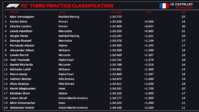 El neerlandés Max Verstappen (Red Bull), en la cima del Mundial de Fórmula 1 (F1), lideró este sábado, por delante de Carlos Sainz (Ferrari), el tercer y último ensayo libre para el Gran Premio de Francia 2020, la carrera número 12 del campeonato, que se disputa en el circuito Paul Ricard de Le Castellet; donde el mexicano Sergio "Checo" Pérez (Red Bull), terminó dentro del Top-5.En la mejor de sus 22 vueltas, Max Verstappen cubrió -con neumático blando- los cinco mil 842 metros de la calurosa pista gala en un minuto, 32 segundos y 272 milésimas, 354 menos que Sainz, que, al haber cambiado varios componentes de la unidad de potencia de su Ferrari, penalizó y saldrá desde el fondo de la parrilla, por lo que sólo giró en 14 ocasiones. El monegasco Charles Leclerc, compañero del piloto madrileño, marcó el tercer crono de la sesión -al igual que los anteriores, con neumáticos blandos-, a 637 milésimas de "Mad Max".Fernando Alonso marcó el séptimo tiempo de la sesión. El doble campeón del mundo repitió 17 veces la pista francesa y en su mejor intento se quedó a un segundo y dos décimas del tiempo de Verstappen, y casi a un segundo al siete veces campeón del mundo inglés Lewis Hamilton (Mercedes), cuarto en la tabla de tiempos de una sesión que se llevó a cabo sin mayores incidencias, y que acabó con 29 grados centígrados ambientales y con 55 en el asfalto."Checo" Pérez, tercero en la clasificación Mundial, y que desea volver a la senda del podio después de retirarse en dos de las últimas tres pruebas, dio 24 vueltas en el último libre y terminó en el quinto lugar. En la mejor de ellas, el piloto tapatío de Red Bull invirtió poco más de un segundo que el líder del Mundial, en un ensayo en el que todos marcaron su vuelta rápida con el compuesto blando.OF