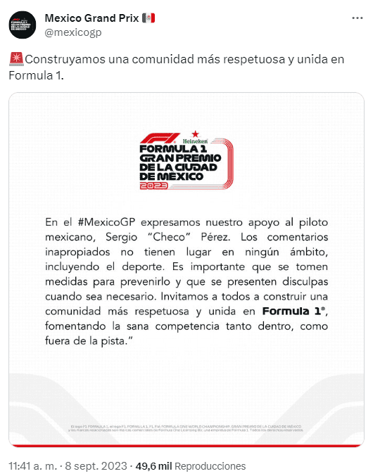 La última semana, el asesor de Red Bull, Helmut Marko, ha sido tema central de la discusión en redes sociales debido a una serie de comentarios que hizo sobre el desempeño del mexicano Sergio "Checo" Pérez en la escudería. Algunos incluso lo han señalado de racista, y tras esto, el austríaco salió para disculparse por lo que dijo."Sobre mi entrevista en el programa Sport und Talk de Servus TV el 4 de septiembre, quisiera aclarar que estoy firmemente convencido de que no se puede generalizar sobre las personas, independientemente de su cultura, nacionalidad u origen", declaró Marko para Servus TV.El asesor dijo tras el Gran Premio de Italia 2023, que se corrió el pasado fin de semana, que por el segundo lugar obtenido por Checo Pérez, "recordemos que él es sudamericano y por eso su cabeza no está tan enfocada como la de Max Verstappen o como era Sebastian Vettel".Hoy, Marko ofreció disculpas al piloto tapatío. "Quería subrayar que, aunque Checo Pérez hizo una gran carrera en Italia, el desempeño de él ha fluctuado mucho este año. Fue un error establecer una conexión con sus orígenes y me gustaría disculparme profundamente por esto".Tras la polémica suscitada en torno a Checo Pérez y Helmut Marko, organizadores del Gran Premio de México publicaron un comunicado en redes sociales en el que piden construir una comunidad más respetuosa y unida en la F1."En el #MexicoGP expresamos nuestro apoyo al piloto mexicano, Sergio 'Checo' Pérez. Los comentarios inapropiados no tienen lugar en ningún ámbito, incluyendo el deporte. Es importante que se tomen medidas para prevenirlo y que se presenten disculpas cuando sea necesario. Invitamos a construir una comunidad más respetuosa y unida en Fórmula 1, fomentando la sana competencia tanto dentro, como fuera de la pista".OF