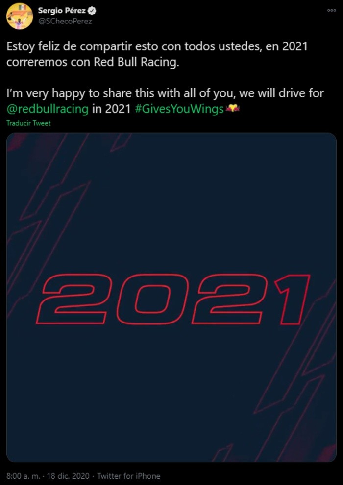 Sergio ''Checo'' Pérez, a través de redes sociales, expresó su felicidad al firmar con la escudería Red Bull Racing para la temporada 2021. ''Estoy feliz de compartir esto con todos ustedes, en 2021 correremos con Red Bull Racing'', expresó el piloto tapatío. ''Checo'', mencionó que sigue cumpliendo metas en F1 y que el vestir los colores de Red Bull es un honor. ''El representar a un equipo como Red Bull que sea aspirante al campeonato es algo que había soñado desde que inicié mi recorrido en F1 y va a ser un honor vestir los colores de Red Bull'', concluyó el piloto tapatío.Christian Horner, el máximo responsable de la escudería mencionó que después de estudiar minuciosamente la decisión y ver el desempeño de los pilotos en el año se llegó a la conclusión que Sergio Pérez era la mejor opción para la escudería. "Después de darnos el tiempo de analizar los datos relevantes y las recientes actuaciones de Sergio, hemos decidido que es el piloto adecuado para acompañar a Max Verstappen el próximo año''.OF