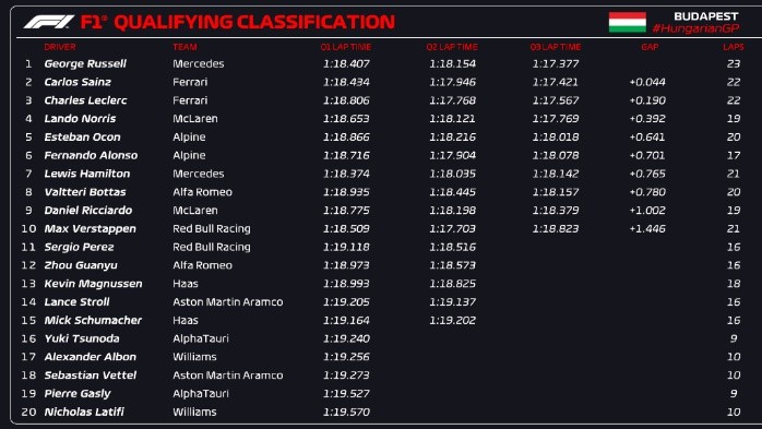 El británico George Russell, de Mercedes, saldrá primero este domingo en el Gran Premio de Hungría, decimotercera carrera Fórmula Uno (F1) 2022, que se disputa en el Hungaroring. El mexicano Sergio "Checo" Pérez fue eliminado en la Q2, y saldrá fuera del Top-10 este 31 de julio.Russell logró la primera "pole" de su carrera, mientras que el español de Ferrari, Carlos Sainz Jr., terminó en el segundo lugar.También fue la primera "pole" de la temporada para Mercedes, que ha tenido una campaña complicada, y que marca en tercer lugar en el campeonato de constructores de 2022.Charles Leclerc, también de Ferrari, completó el Top-3 para el inicio de la carrera de este domingo.El campeón de 2021, Max Verstappen, compañero de "Checo" Pérez en Red Bull, saldrá en el GP de Hungría desde la décima posición, detrás de Daniel Ricciardo de McLaren en noveno, y delante de Pérez, en decimoprimer lugar.OF