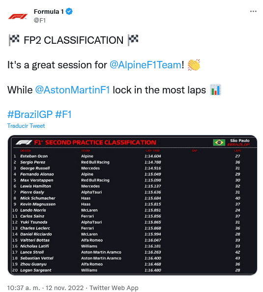 Sergio "Checo" Pérez mejoró su rendimiento previo al Gran Premio de Brasil y terminó en el segundo puesto durante la práctica libre 2.El mejor tiempo fue para Esteban Ocon de la escudería Alpine, que terminó en el primer sitio con 1:14.604 en el cronómetro.Le siguió Checo Pérez, que marcó un tiempo de 1:14.788 y en el tercer sitio está George Russell, el piloto de Mercedes registró 1:14.916.El que llamó la atención en el Gran Premio de Brasil el viernes fue el piloto de Haas, Kevin Magnussen, ya que ganó la "pole position" para la carrera sprint de hoy sábado.Para la práctica libre 2, Magnussen terminó hasta la novena posición con 1:15.815 en el cronómetro.Checo Pérez y el resto de los pilotos regresarán este sábado al Autódromo José Carlos Pace para disputar la carrera sprint a las 13:30 horas, tiempo del centro de México.OF