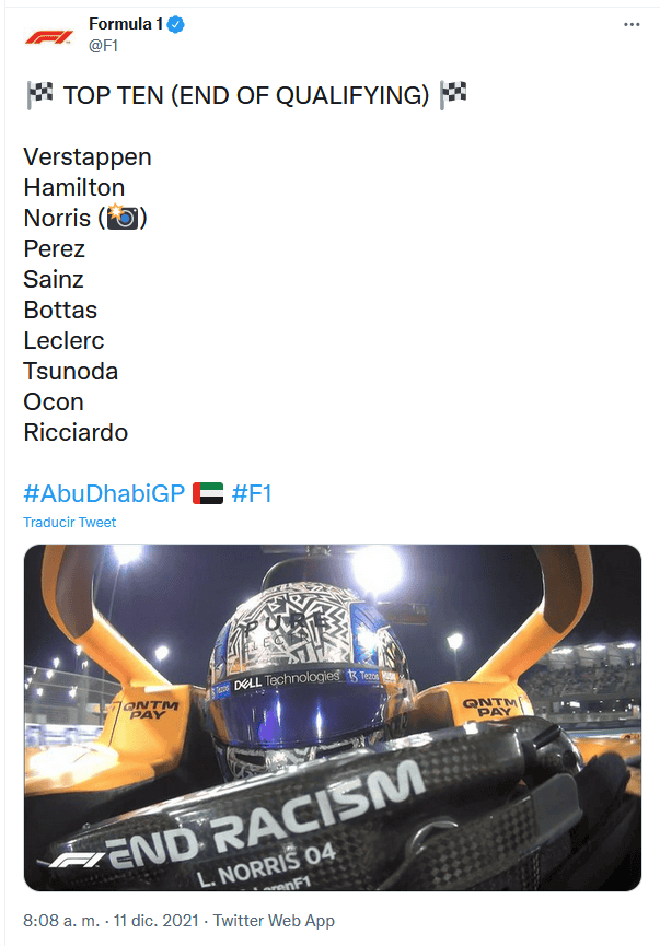 Red Bull dio la sorpresa este sábado en la clasificación para el Gran Premio de Abu Dabi, en la que el piloto neerlandés Max Verstappen logró la "pole position" por delante del británico y siete veces campeón del mundo Lewis Hamilton, mientras que el mexicano Sergio "Checo" Pérez se colocó en la cuarta posición, de la cual saldrá mañana domingo en el circuito de Yas Marina, en Emiratos Árabes Unidos.Mañana, Verstappen saldrá primero, justo por delante de Lewis Hamilton (Mercedes) en la última carrera del año, que decidirá el Mundial de F1 entre ellos -empatados a puntos (369.5) pero con ventaja del primero al contar un triunfo más (nueve del neerlandés por ocho del británico). "Checo" Pérez fue superado por el finlandés Valtteri Bottas, que dejará Mercedes a partir de la siguiente temporada.Verstappen dominó la calificación al cubrir los cinco mil 281 metros de la pista en un minuto, 22 segundos y 109 milésimas, 371 menos que Hamilton.Desde la segunda línea en la parrilla de salida saldrán el inglés Lando Norris (McLaren) y el mexicano "Checo" Pérez, que fue cuarto, a 838 milésimas de Verstappen.OF