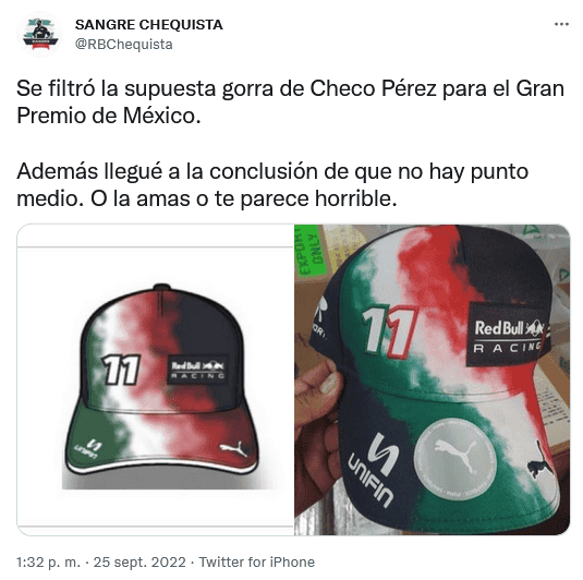 El Gran Premio de México de la F1 está a menos de dos meses de llevarse a cabo en el Autódromo Hermanos Rodríguez de la capital, y en redes sociales ya circulan rumores sobre sorpresas que habría, entre estos, una imagen de la gorra que el piloto mexicano Sergio "Checo" Pérez utilizará para la carrera. ¿Ya la viste?Especulan que el equipo Red Bull, en el que milita el tapatío, habría pedido un diseño especial para los días en que se desarrolle la competencia.El GP de México se desarrollará del 28 al 30 de octubre de 2022.La cuenta de Twitter @RBChequista publicó una foto de la presunta gorra, que tiene como característica principal los colores de la bandera de México, además del número "11" que lleva "Checo" Pérez y el logo de Red Bull.Hasta el momento, ni Red Bull ni "Checo" Pérez han confirmado los rumores.Hace unos días se dio a conocer el calendario del Campeonato del Mundial de F1 de 2023, que contará con 24 grandes premios, según aprobaron este martes los miembros del Consejo Mundial del Deporte del Motor de la Federación Internacional del Automóvil (FIA).El próximo año se tiene contemplada una carrera en el país, y según el cronograma, el Gran Premio de México se realizará el 29 de octubre de 2023.OF