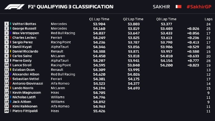 El mexicano Sergio ''Checo'' Pérez continuó este sábado con los buenos resultados en la última prueba libre, y se colocó en en el Top-5 para el Gran Premio de Sakhir.''Checo'' Pérez se ubicó en la quinta posición para el segundo GP que se correrá en Baréin, carrera en la que el finlandés Valtteri Bottas saldrá desde la ''pole''.Bottas dominó este sábado la sesión de calificación al cubrir los tres mil 543 metros de la pista en 53 segundos y 377 milésimas, 26 menos que inglés George Russell, que sustituye en Mercedes a su compatriota y siete veces campeón del mundo de F1 Lewis Hamilton (positivo por COVID-19). Russell, de 22 años y habitual piloto de Williams, cumplió a la perfección y se quedó a sólo dos centésimas del tiempo de Bottas, que firmó su decimosexta ''pole'' desde que pilota en Fórmula Uno.El holandés Max Verstappen (Red Bull), tercero en el Mundial -a 12 puntos de Bottas- saldrá tercero, desde la segunda fila, que completa el monegasco Charles Leclerc (Ferrari). ''Checo'' lo hará desde la tercera, al lado del ruso Daniil Kvyat (Alpha Tauri).Sainz saldrá desde la cuarta hilera, justo al lado del australiano Daniel Ricciardo (Renault), séptimo en la calificación de este sábado.OF