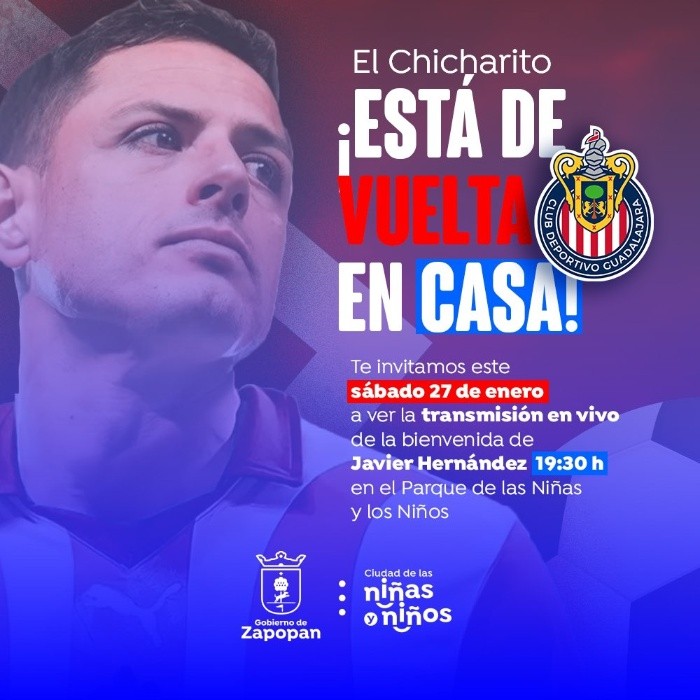 ¿No conseguiste boleto para ir al al estadio y ver el regreso del "Chicharito" a las Chivas esta noche? Tenemos una muy buena opción para que puedas verlo.El Parque de las Niñas y los Niños del Gobierno de Zapopan, anunció que transmitirá en vivo la bienvenida de Javier Hernández este sábado 27 de enero a las 19:30 horas.A través de sus redes sociales, el Gobierno de Zapopan agradeció el apoyo de Cinema Live, quien hará posible la transmisión del regreso del Chicharito, y adelantó que la siguiente semana el cine volverá su horario habitual. Dicha transmisión será en la pantalla de Cine al aire libre del parque, y la entrada es completamente gratuita. El Parque de las Niñas y los Niños está ubicado en la calle Sta. Lucía 284, colonia Tepeyac, 45150 Zapopan, lo que se conoce como “la curva”.NA