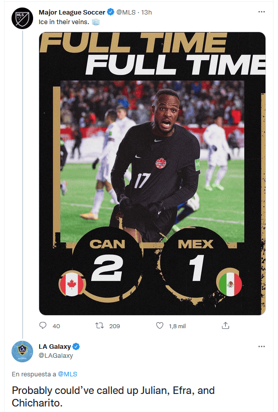La Selección de México volvió a perder, esta vez por 2-1 contra Canadá, en las eliminatorias de la Concacaf rumbo al Mundial de Qatar 2022. Ante este resultado, el equipo de Los Angeles Galaxy publicó una respuesta que podría ser vista como un mensaje para el Tricolor, quien no ha convocado al delantero Javier "Chicharito" Hernández desde hace algún tiempo.En esta Fecha FIFA, México suma dos derrotas, una ante Canadá y la otra contra Estados Unidos, mientras que ha recibido cuatro goles y solo ha anotado uno. Desde hace algunos meses es discusión si el "Chicharito" Hernández debe ser llamado por el técnico Gerardo "Tata" Martino, quien no lo ha contemplado por algún tiempo, mientras que su equipo carece de goles en los momentos más importantes. Ayer así lo consideró el LA Galaxy, equipo donde juega el ex elemento de Chivas, tras responder de manera contundente a un mensaje de la MLS.En Twitter, la MLS publicó el resultado del partido, y el Galaxy aprovechó para contestar: "Probablemente podría haber llamado a Julián, Efra y 'Chicharito'".Julián Araujo y Efraín Álvarez no han sido elementos tan destacados para México, sin embargo, "Chicharito" Hernández es el goleador histórico de la Selección, sin embargo, desde hace mucho se le cuestiona al "Tata" Martino por qué no lo convoca a los partidos sin que hasta ahora haya dado una explicación convincente.De hecho, en redes sociales comenzó a circular hace algunos días una petición en change.org para que el "Tata" vuelva a pedir la presencia del tapatío con el equipo mexicano, ya que este año vivió una gran temporada con el LA Galaxy, donde convirtió 17 goles.OF