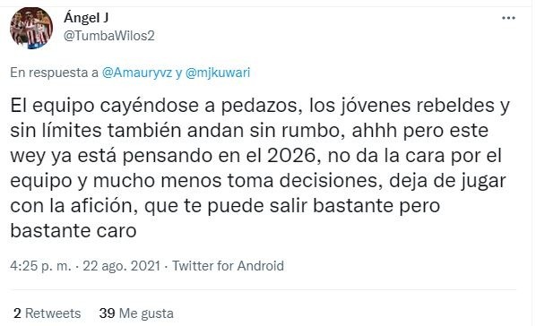 Amaury Vergara, presidente de las Chivas Rayadas de Guadalajara, compartió en redes sociales la visita de Mohammed Alkuwari, embajador de Qatar en México, al estadio Akron.Vergara publicó fotos de ambos en la cancha, así como del recorrido en las instalaciones y en un tweet reveló el motivo de la reunión."Tuvimos el gran honor de recibir en nuestro Estadio al Embajador de Qatar en México, Mohammed Alkuwar, para charlar de lo que más nos apasiona, de cara al próximo mundial. Muchísimas gracias por tu visita, Mohammed", escribió Amaury.Aficionados del Guadalajara comentaron la publicación, reclamando el mal paso del equipo en el Apertura 2021.Varias respuestas al tweet de Amaury Vergara coinciden qué debería hacer algo por el club, que no pasa por el mejor momento futbolístico. Si quieres tener más contenido, más imágenes y aún más noticias, entonces descarga INFORMAPlus, la aplicación digital de EL INFORMADOR, donde tenemos materiales exclusivos para tí.Descarga la aplicación y pruébala GRATIS por treinta días. Para iOS: https://apple.co/35jaVgbPara Android: https://bit.ly/3gwVSEVSi eres suscriptor de EL INFORMADOR tu acceso está incluido, solicítalo al 33 3678-7777JL