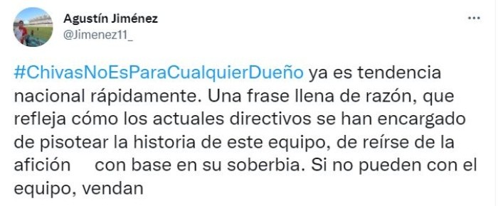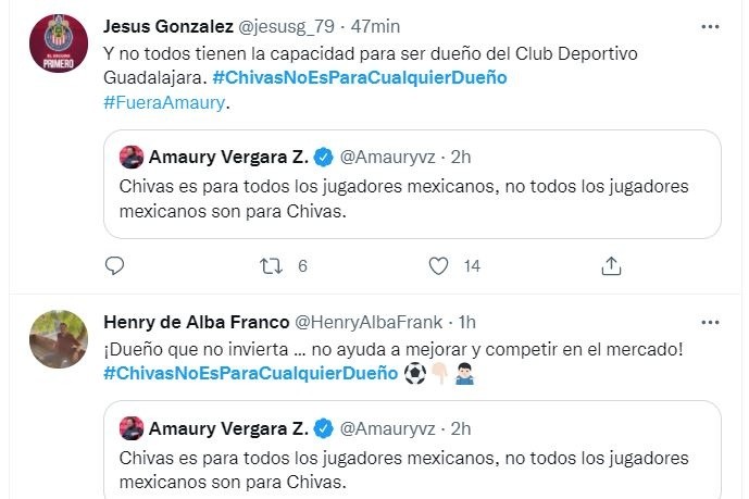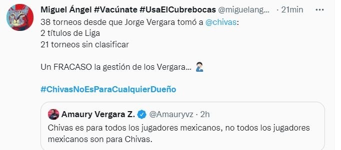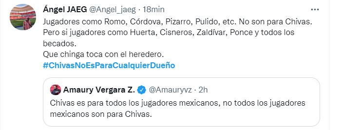 A través de sus redes sociales, Amaury Vergara compartió un polémico mensaje en el que aseguraba que Chivas es para todos los jugadores mexicanos, pero no todos los jugadores mexicanos son para el Rebaño y la respuesta de la afición rojiblanca no se hizo esperar.Apenas unas horas después del mensaje del dueño del Rebaño, la afición del Guadalajara ha logrado posicionar el hashtag #ChivasNoEsParaCualquierDueño como una de las tendencias a nivel nacional en Twitter, dejando en claro que no están contentos con el accionar de Amaury al frente del redil. La molestia de la afición rojiblanca radica en la poca capacidad que ha mostrado Amaury Vergara y la directiva en el tema de fichajes, pues al inicio sonaban nombres como Córdova, Pizarro, Romo y algunos otros y al final esos jugadores han terminado en otros clubes que sí han sabido negociar. Eso, aunado a los fracasos deportivos que se han tenido en los últimos torneos en donde incluso el Guadalajara no ha logrado meterse a Liguilla, han hecho que la afición estalle en contra de sus dirigentes. A continuación, te compartimos algunos de los mensajes que ha mandado la afición de Chivas a su actual dueño bajo el hashtag #ChivasNoEsParaCualquierDueño: JL