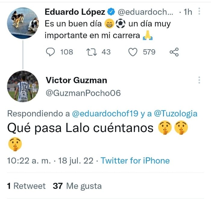 Esta semana podría hacerse oficial el tema de Santiago Ormeño a Chivas y Eduardo "Chofis" López a Pachuca, pues diversos reportes apuntan a que el canterano del Guadalajara habría cedido para irse a préstamo a los Tuzos.En ese entendido, ha saltado a la vista la publicación de "Chofis" respecto a su futuro, pues el habilidoso mediocampista aseguró que este lunes será un día especial para su carrera como futbolista profesional."Es un buen día. Un día muy importante en mi carrera", publicó "Chofis" en su cuenta oficial de Twitter en medio de las versiones que lo ponen como refuerzo de Pachuca para este torneo Apertura 2022.Para alimentar aún más la curiosidad de los aficionados, esa publicación de López fue comentada por Víctor Guzmán, futbolista de los Tuzos que le pidió a "Chofis" que le contara lo que estaba pasando.OF