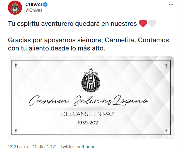 Luego de que se diera a conocer la muerte de la primera actriz Carmen Salinas, Chivas expresó en sus redes sociales un sentido mensaje hacia consideraban su fiel seguidora. La actriz siempre manifestó su pasión por el equipo de Guadalajara."Gracias por apoyarnos siempre, Carmelita. Contamos con tu aliento desde lo más alto", dice el texto que fue publicado en las redes de Chivas.Carmen Salinas falleció el jueves 9 de diciembre de 2021 a los 82 años, luego de pasar casi un mes internada en un hospital tras haber sufrido un derrame cerebral.La actriz siempre demostró su fanatismo por Chivas, mismo que comenzó desde el año de 1957 y lo presumió con orgullo, ya que tenía más de 60 años apoyando al Rebaño."Tu espíritu aventurero quedará en nuestros corazones", expresó Chivas.Carmelita Salinas fue considerada la madrina vitalicia de Chivas, y será recordada por su presencia en la final de Chivas contra Toros Neza del Verano de 1997.La actriz Carmen Salinas nació en Torreón, Coahuila, el 5 de octubre de 1939.Inició su carrera en la comedia, en donde su papel como "La Corcholata" la hizo triunfar en el medio del espectáculo.Carmen Salinas participó en películas "de ficheras" como "Bellas de Noche", "La pulquería" o "Las cariñosas", e incursionó en el cine internacional en "Hombre en llamas" y "La misma luna".También fue actriz en telenovelas de Televisa, como "María Mercedes", "Ábrazame muy fuerte" y "Mi pequeña traviesa".Fue también productora. Su mayor éxito en esta faceta es en la obra de teatro "Aventurera", en donde Itatí Cantoral, Edith González y Niurka han brillado como bailarinas.OF