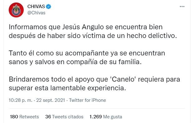 Después de que se reportara la privación de la libertad del jugador de Chivas, Jesús Ángulo, mientras estaba acompañado de su novia, el club ha enviado un mensaje en el que aseguran que el futbolista se encuentra bien y que le brindarán el apoyo que requiera.Según el comunicado, emitido en redes sociales, "tanto él como su acompañante ya se encuentran sanos y salvos en compañía de su familia".Chivas agrega "brindaremos todo el apoyo que el "Canelo" requiera para superar esta lamentable experiencia".El jugador habría sido privado de la libertad por hombres armados mientras circulaba, a bordo de su vehículo, rumbo a San Juan de Ocotán.Momentos después, tras un operativo policiaco, Angulo y la persona con la que viajaba fueron puestos en libertad, y el vehículo marca Jeep del futbolista se encuentra asegurado.Si quieres tener más contenido, más imágenes y aún más noticias, entonces descarga INFORMAPlus, la aplicación digital de EL INFORMADOR, donde tenemos materiales exclusivos para tí.Descarga la aplicación y pruébala GRATIS por treinta días. Para iOS: https://apple.co/35jaVgbPara Android: https://bit.ly/3gwVSEVSi eres suscriptor de EL INFORMADOR tu acceso está incluido, solicítalo al 33 3678-7777JL