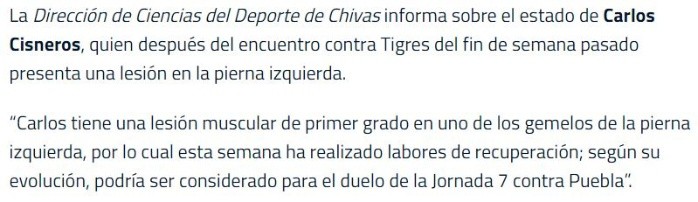 El Guadalajara no contará con Carlos Cisneros para el juego de este sábado entre Chivas y León. “Carlos tiene una lesión muscular de primer grado en uno de los gemelos de la pierna izquierda, por lo cual esta semana ha realizado labores de recuperación; según su evolución, podría ser considerado para el duelo de la Jornada 7 contra Puebla”, informó el Rebaño en un comunicado. Será este sábado a las 21:00 horas cuando el Rebaño se mida a León en territorio esmeralda.JL