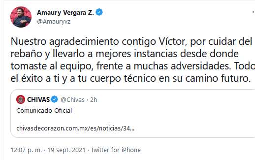 Este domingo, Chivas anunció la salida del técnico Víctor Manuel Vucetich, después de 13 meses en el cargo y de inmediato, Amaury Vergara, propietario del equipo, publicó un mensaje para despedirlo."Nuestro agradecimiento contigo Víctor, por cuidar del rebaño y llevarlo a mejores instancias desde donde tomaste al equipo, frente a muchas adversidades", publicó en su cuenta de Twitter.Vucetich estuvo al frente de Chivas durante tres torneos, llegó en la Jornada 6 del Guard1anes 2020, dirigió todo el Guard1anes 2021 y tras nueve juegos del Torneo Apertura 2021 terminó su ciclo rojiblanco."Todo el éxito a ti y a tu cuerpo técnico en su camino futuro", fue la despedida de Vergara hacia Vucetich.De momento se rumora que Marcelo Michel Leaño será el técnico interino de Chivas.¿Quieres saber más?Si quieres tener más contenido, más imágenes y aún más noticias, entonces descarga INFORMAPlus, la aplicación digital de EL INFORMADOR, donde tenemos materiales exclusivos para ti.Descarga la aplicación y pruébala GRATIS por treinta días.Si eres suscriptor de EL INFORMADOR tu acceso está incluido, solicítalo al 33 3678-7777OF