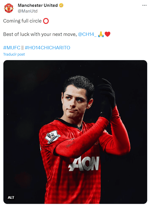 Un viejo amor no se olvida ni se deja, y eso lo saben perfectamente en el Manchester United.Apenas se dio a conocer que Chivas fichó a Javier "Chicharito" Hernández y desde Inglaterra no dudaron en mandarle un mensaje de buena vibra al su ex delantero."Completando el círculo. Mucha suerte con tu próximo movimiento, 'Chicharito'", fue el mensaje que el cuadro británico le dedicó al atacante que fichó con ellos en el ya lejano 2010.Hernández hizo historia en el Manchester United al convertirse en el mexicano con más goles en la Liga Premier de Inglaterra, esto además de ser el futbolista latino con más anotaciones en el conjunto Red Devils por encima de jugadores de la talla de Carlos Tevez.En cuanto a títulos, Hernández levantó la Premier League en dos ocasiones, y se quedó a la orilla de alzar la Champions después de que perdiera la Final del 2011 ante el Barcelona de Pep Guardiola y Lionel Messi.El dato"Chicharito" marcó 59 goles con el United en un total de 157 partidos disputados.*Mantente al día con las noticias, únete a nuestro canal de WhatsAppOF