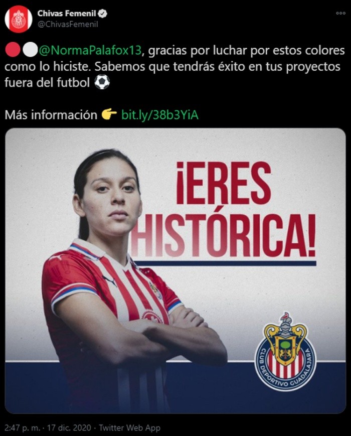 Chivas femenil informó que la delantera Norma Palafox no seguirá con el equipo.A través de un comunicado, el equipo tapatío informó que ''luego de varias semanas de negociación en las que ambas partes mostraron su genuino interés por prolongar el vínculo contractual que mantenían, Norma Palafox determinó dejar de ser parte de Chivas Femenil dado que emprenderá de nueva cuenta un proyecto profesional fuera del futbol''.Además resaltó que la jugadora se despide como ''una jugadora histórica'', pues en su estancia de tres años -en dos etapas- disputó 90 partidos oficiales, 72 de ellos como titular, con un total de seis mil 135 minutos de juego, y siendo además la máxima goleadora histórica del equipo, con 21 goles.''En Chivas Femenil siempre le estaremos agradecidos por todo el profesionalismo, pundonor y cariño que mostró para defender la playera rojiblanca y le deseamos lo mejor en lo que venga para su carrera'', dice el texto publicado en la página oficial.OF