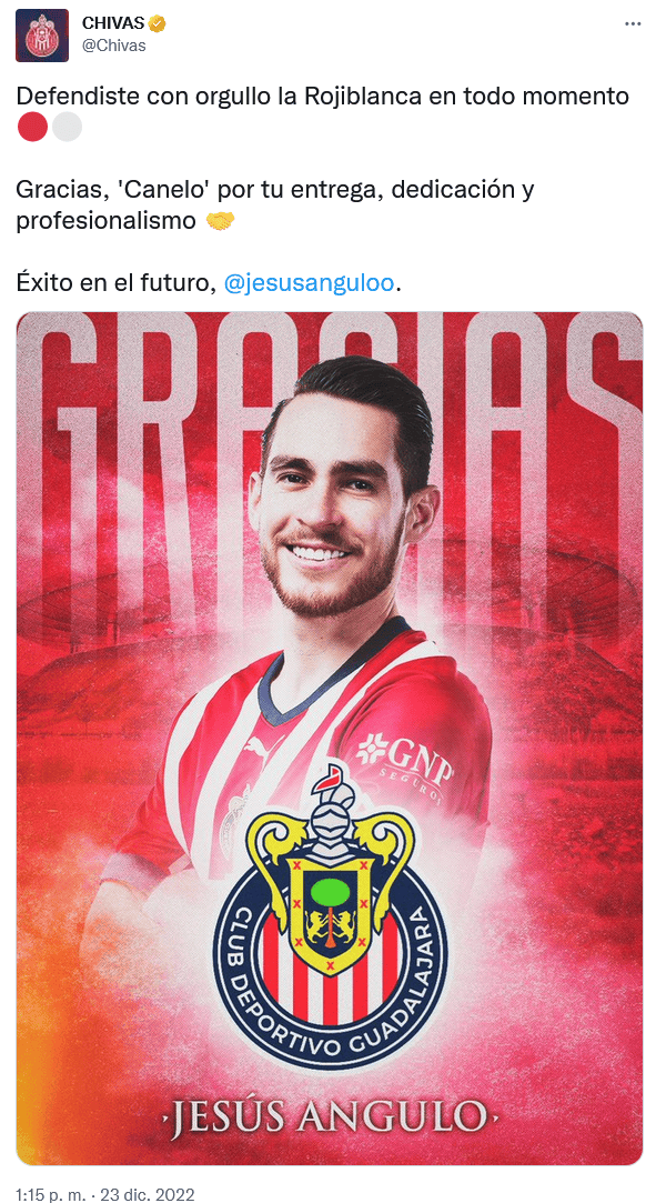Jesús "Canelo" Angulo ha dejado de ser jugador de Chivas, así lo informó el club en su cuenta oficial en sus redes sociales, en donde se despidió del volante con un emotivo mensaje señalando que "defendiste con orgullo la Rojiblanca en todo momento".Con esto, el jugador sinaloense se alista para jugar para los Esmeraldas de León, luego de que Grupo Pachuca se hiciera oficialmente de los derechos del futbolista, para así ayudar a que Víctor "Pocho" Guzmán sea jugador del Rebaño Sagrado a partir del Clausura 2023.Angulo se suma a las bajas de Jesús Molina que irá a Pumas, así como Miguel Ángel Ponce, jugadores a los cuales el Guadalajara dejó ir una vez finalizado el torneo pasado.Se espera que en los próximos días se confirme la salida de más jugadores, como Antonio Rodríguez y Ángel Zaldívar.OF