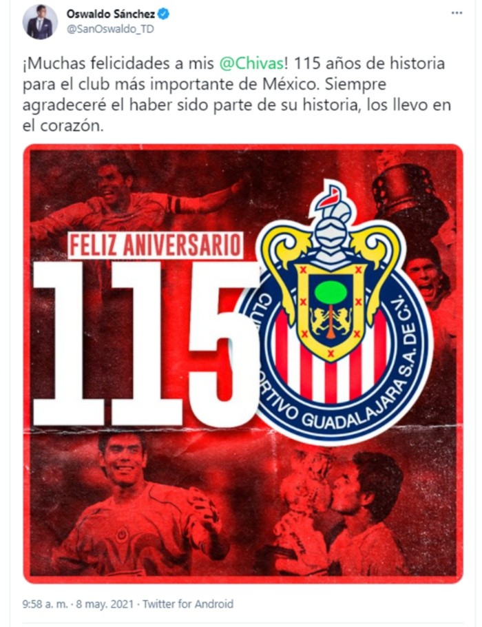 De todos lados le llovieron las felicitaciones a Chivas, iniciando con todos los clubes de la Liga MX, así como ex jugadores que marcaron diferencia y los que no tanto. La afición aprovechó para inundar las redes sociales mostrando su amor por la institución subiendo fotos con su playera rojiblanca.El presidente Amaury Vergara en sus cuentas oficiales en redes sociales, le mandó un mensaje a toda la nación rojiblanca: ''Hoy celebramos 115 años de unión, historia e identidad, esa que en cada conversación nos llena el pecho de orgullo cuando hablamos de nuestro principio más grande, el de ser puros mexicanos, ¡arriba las @Chivas!''.Todos los jugadores del primer equipo también se manifestaron, entre ellos Jesús Sánchez, quien puso esto en sus redes: ''115 años de historia y tradición, felicidades @Chivas gracias por formarme como futbolista pero sobretodo como persona, eres y seguirás siendo el más GRANDE por lo que representas y lo que generas en más de 40 millones de personas''.Ex jugadores rojiblancos que fueron capitanes del ''Rebaño'' también se manifestaron, todos pusieron mensajes y su sentir por los colores rojiblancos, entre ellos los ex capitanes Ramón Morales, Joel Sánchez y Carlos Salcido.El ''Tiburón'' recordó con mucho cariño a quienes pusieron los cimientos de la grandeza rojiblanca, los campeonísimos: ''Calderón, Chaires, Sepúlveda, Villegas, Jasso, Valdivia, Ponce, Díaz, Hernández, Reyes, Jara y muchas figuras más, mi reconocimiento y gratitud para ustedes por este gran legado, nos dejaron demasiado cariño de toda la familia @Chivas felices 115 años de historia y grandeza''.Osvaldo Sánchez, ex capitán rojiblanco también se manifestó, aunque algunos aficionados no tomaron a bien su comentario y le seguían reclamando el haberse ido de la institución por dinero, un tema añejo que utilizan algunos solamente para molestar.''¡Muchas felicidades a mis @Chivas! 115 años de historia para el club más importante de México. Siempre agradeceré el haber sido parte de su historia, los llevo en el corazón''.La Federación Mexicana de Futbol también emitió una felicitación para el club Guadalajara por su aniversario, así como otros equipos internacionales, principalmente donde jugaron elementos nacidos en la cantera rojiblanca, como el Bayer Leverkusen.Conoce más de la historia del Rebaño Sagrado. Disfruta del suplemento especial "Chivas 115 años" que encontrarás exclusivamente en InformaPlus. Ingresa a este link, descarga la aplicación y disfruta de 10 días de prueba gratis.OF