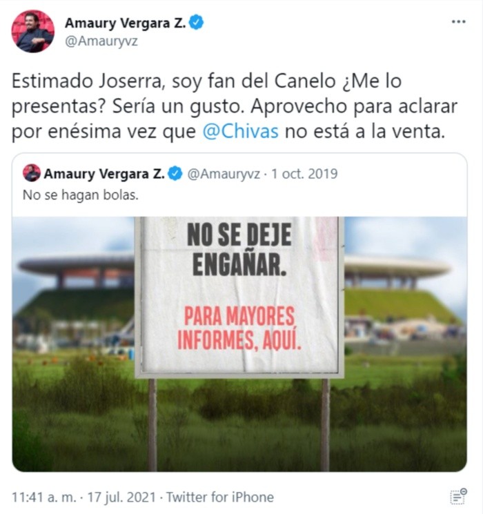 Luego de que nuevamente se difundieran rumores de la posible venta de Chivas, el presidente del equipo, Amaury Vergara, apareció en redes sociales para responder de manera tajante.En su cuenta personal de Twitter, Amaury Vergara dijo nuevamente que Chivas no se vende bajo ninguna circunstancia.Vergara citó un tuit con fecha de octubre de 2019 en el que hay había dicho que:"El equipo no está en venta. No se deje engañar'', dice este mensaje. ''Para mayores informes aquí'. No se hagan bolas''.El líder de la directiva rojiblanca aprovechó para mencionar a José Ramón Fernández, a quien le pidió que le presentara al boxeador jalisciense Saúl ''Canelo'' Álvarez, a quien se ha señalado como uno de los interesados en comprar a Chivas.''Estimado Joserra, soy fan del Canelo ¿Me lo presentas? Sería un gusto'', dijo Amaury Vergara también en Twitter.Un medio estadounidense indicó que ''Canelo'' Álvarez había hecho una oferta formal para comprar al Rebaño, cosa que según Amaury Vergara no es real.OF