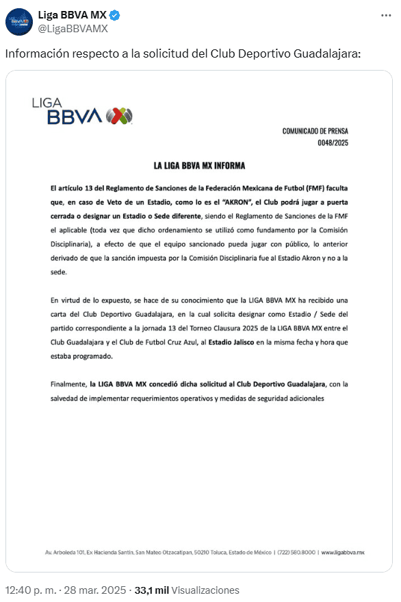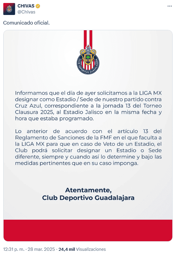 Después de que la Comisión Disciplinaria no accediera a levantar el castigo de veto al Estadio AKRON, el equipo de Chivas realizó una solicitud a la Liga MX de poder llevar a cabo el partido contra Cruz Azul a disputarse este sábado 29 de marzo a las 21:05 horas en el Estadio Jalisco.Este viernes, a través de un comunicado publicado en redes sociales, las Chivas informaron sobre esta petición que se apega al artículo 13 del Reglamento de Sanciones de la FMF para que los aficionados puedan asistir al duelo frente a los cementeros."Informamos que el día de ayer solicitamos a la LIGA MX designar como Estadio / Sede de nuestro partido contra Cruz Azul, correspondiente a la jornada 13 del Torneo Clausura 2025, al Estadio Jalisco en la misma fecha y hora que estaba programado.Lo anterior de acuerdo con el artículo 13 del Reglamento de Sanciones de la FMF en el que faculta a la LIGA MX para que en caso de Veto de un Estadio, el Club podrá solicitar designar un Estadio o Sede diferente, siempre y cuando así lo determine y bajo las medidas pertinentes que en su caso imponga".Ante esta solicitud, la Liga MX inmediatamente lanzó otro comunicado en el que se concedió permiso para que el compromiso correspondiente de la jornada 13 del Clausura 2025 se traslade al coloso de la Calzada Independencia."En virtud de lo expuesto, se hace de su conocimiento que la LIGA BBVA MX ha recibido una carta del Club Deportivo Guadalajara, en la cual solicita designar como Estadio / Sede del partido correspondiente a la jornada 13 del Torneo Clausura 2025 de la LIGA BBVA MX entre el Club Guadalajara y el Club de Futbol Cruz Azul, al Estadio Jalisco en la misma fecha y hora que estaba programado.Finalmente, la LIGA BBVA MX concedió dicha solicitud al Club Deportivo Guadalajara, con la salvedad de implementar requerimientos operativos y medidas de seguridad adicionales", dice el comunicado.Si bien, en el Reglamento de Sanciones de la FMF está estipulado que, en caso de veto a un estadio, el club puede solicitar designar otra sede, en el artículo 47 del Reglamento de Competencia de la Liga MX temporada 2024-25 dice que, si esto se desea aplicar, la distancia entre los recintos debe de ser de 50 km. En ese sentido, el Estadio AKRON y el Jalisco se encuentran separados por 21.1 km, por lo que, en teoría, el partido entre Chivas y Cruz Azul no debió de ser permitido para que se desarrollara en el Coloso de la Calzada Independencia.*Mantente al día con las noticias, únete a nuestro canal de WhatsAppOF