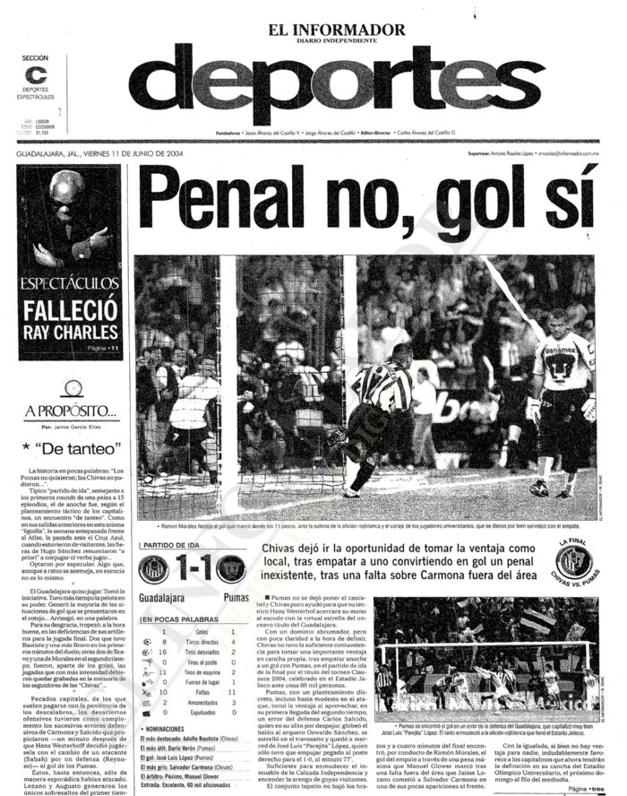 Fueron varios los títulos que Chivas ganó como local en el Estadio Jalisco y también varios los que perdió. Sin embargo, el que dejó ir ante Pumas en el muy recordado Clausura 2004, no se definió sino hasta la vuelta en Ciudad Universitaria. A aquella final el Guadalajara y los de la UNAM llegaron con la misión de no dar un balón por perdido, pues lograron un agónico empate de 1-1 en la ida en la que entonces era la casa del Rebaño."Con un dominio abrumador, pero con poca claridad a la hora de definir, Chivas no tuvo la suficiente contundencia para tomar una importante ventaja en cancha propia, tras empatar anoche a un gol con Pumas, en el partido de ida de la final por el título del torneo Clausura 2004, celebrado en el Estadio Jalisco ante unas 60 mil personas", dice la crónica del juego publicada el 11 de junio de aquel año de EL INFORMADOR."Pumas, con un planteamiento discreto, incluso hasta modesto en el ataque, tomó ventaja al aprovechar, en su primera llegada del segundo tiempo, un error del defensa Carlos Salcido, quien en su afán por despejar, globeó el balón al arquero Oswaldo Sánchez, se estrelló en el travesaño y quedó a merced de José Luis 'Parejita' López, quien sólo tuvo que empujar pegado al poste derecho para el 1-0 al minuto 77".Los aficionados de Chivas aquella tarde se quedaron callados ante el que era el final del primer capítulo, ya que parecía que la suerte no los acompañaba y sus atacantes no lograban encontrar la manera de que alguno de sus tiros a puerta perforara la portería de Sergio Bernal.Sin embargo, "El conjunto tapatío no bajó los brazos y a cuatro minutos del final encontró, por conducto de Ramón Morales, el gol del empate a través de una pena máxima" que el árbitro Manuel Glower marcó tras una falta en el área del ahora entrenador de la Selección Mexicana, Jaime Lozano, sobre Salvador Carmona."Con la igualada, si bien no hay ventaja para nadie, indudablemente favorece a los capitalinos que ahora tendrán la definición en su cancha" el domingo 13 de junio al mediodía.La suerte siguió con Pumas aquella vez.ChivasPumasPumas volverá a visitar a Chivas. En esta ocasión se medirán en la ida de los Cuartos de Final del Apertura 2023, una serie que el Guadalajara quiere superar para volver a jugar la final, y sacarse la espina luego de haber caído apenas en la disputa por el título del pasado Clausura 2023, esa vez ante Tigres.*Mantente al día con las noticias, únete a nuestro canal de WhatsAppOF
