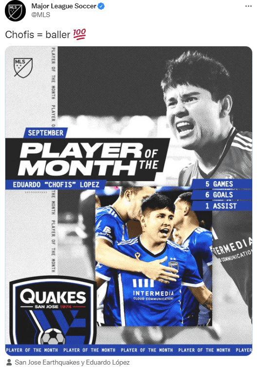 La Major League Soccer (MLS) anunció que Eduardo "Chofis" López fue catalogado como el jugador del mes de septiembre. 'Chofis' López disputó cinco juegos con el San Jose Earthquakes en donde anotó seis goles y además registró una asistencia. Las anotaciones del mexicano se dividieron en una ante LAFC, dos frente a Austin FC, en ambos juegos el San Jose consiguió la victoria. Eduardo consiguió un "hat trick" contra el Real Salt Lake, sin embargo, los tres goles de López bi fueron suficientes porque su equipo perdió 4-3. 'Chofis' López y el San Jose Earthquakes se enfrentan este jueves en partido amistoso a Cruz Azul en el PayPal Park. AA