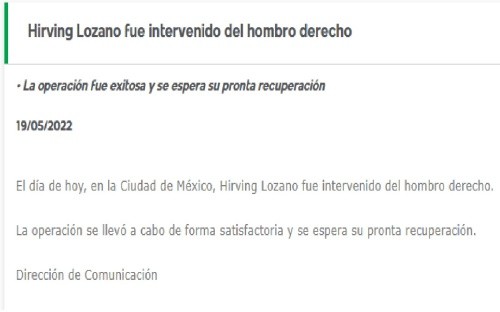 El jugador mexicano Hirving "Chucky" Lozano viajó desde Nápoles, Italia hacía México para ser operado luego de sufrir una lesión.Lozano, quien juega en el Napoli, de la Serie A, llegó a la Ciudad de México para que operaran su hombro derecho, la sesión ocurrió en aquel partido en el Estadio Azteca el 2 de febrero, donde la Selección Mexicana enfrentó a Panamá.A través de un comunicado el tricolor anunció la situación del delantero tras la cirugía del jueves por la noche."Hirving Lozano fue intervenido del hombro derecho. La operación se llevó a cabo de forma satisfactoria y se espera su pronta recuperación", se lee.Por este motivo, Lozano no entró en la más reciente convocatoria de Gerardo "Tata" Martino para los partidos amistosos y de la Nations League que tiene en puerta el Tricolor.MF