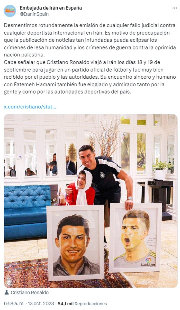 Por algunas horas circuló la noticia de que el delantero estrella de la Selección de Portugal, Cristiano Ronaldo, habría sido sentenciado a una pena severa por reunirse con una mujer iraní.Se dijo incluso que el ex del Real Madrid y actual jugador del Al-Nassr de Arabia Saudita debía recibir 99 latigazos como condena por haber besado en la frente a la artista local Fatemeh Hamami, quien sufre de una parálisis corporal del 85% y que en el encuentro le dio como regalo un par de pinturas elaboradas con sus pies.Sin embargo, la embajada de Irán en España desmintió rotundamente la versión, señalado que "Es motivo de preocupación que la publicación de noticias tan infundadas pueda eclipsar los crímenes de lesa humanidad y los crímenes de guerra contra la oprimida nación palestina"."Desmentimos rotundamente la emisión de cualquier fallo judicial contra cualquier deportista internacional en Irán. Es motivo de preocupación que la publicación de noticias tan infundadas pueda eclipsar los crímenes de lesa humanidad y los crímenes de guerra contra la oprimida nación palestina. Cabe señalar que Cristiano Ronaldo viajó a Irán los días 18 y 19 de septiembre para jugar en un partido oficial de futbol y fue muy bien recibido por el pueblo y las autoridades. Su encuentro sincero y humano con Fatemeh Hamami también fue elogiado y admirado tanto por la gente y como por las autoridades deportivas del país", dice la publicación en la cuenta de X (antes Twitter).Los diferentes medios que dieron a conocer la presunta sentencia contra Cristiano Ronaldo indican que según las leyes de Irán, la acción ocurrida entre el futbolista y la artista es similar al adulterio, además de que al no estar casados, se impiden muestras cariñosas entre dos personas. OF