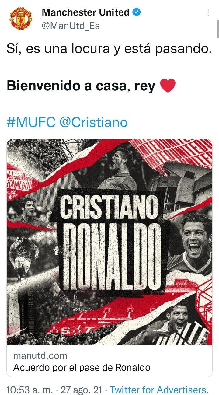 Este viernes, el Manchester United de la Premier League reveló que el futbolista portugués Cristiano Ronaldo regresa a Old Trafford.''Sí, es una locura y está pasando. Bienvenido a casa, rey'', dice la cuenta de Twitter de los Diablos Rojos.Luego de varios rumores que circularon el jueves y que ponían a Cristiano Ronaldo en el Manchester City, su rival de ciudad, el Manchester United anunció que el futbolista portugués regresará a sus filas, tras haber llegado a un acuerdo con la Juventus, ''sujeto a acuerdo de condiciones personales, visado y médico''.El equipo resalta la carrera de Cristiano, quien ha sido ganador del Balón de Oro en cinco ocasiones, ha ganado más de 30 trofeos importantes durante su carrera, incluidos cinco títulos de la Champions League, cuatro Copas Mundiales de Clubes de la FIFA, siete títulos de liga en Inglaterra, España e Italia, y la Eurocopa con Portugal en 2016.En su primera etapa con el Manchester United, Cristiano Ronaldo marcó 118 goles en 292 partidos.''Todos en el club esperan dar la bienvenida a Cristiano de nuevo a Manchester'', dice el texto.La misma mañana de este viernes, el entrenador del Manchester United, Ole Gunnar Solskjaer se mostró dispuesto al fichaje de Cristiano Ronaldo, sugiriendo que los Red Devils podrían hacer un esfuerzo para contratarlo."Siempre hemos tenido un buen contacto -con Cristiano Ronaldo-. Sé que Bruno (Fernandes) también habló con él. Si tiene que salir de la Juventus, sabe que estamos aquí", dijo entonces el técnico noruego, lo que abría la posibilidad de que regresara a la que fue ''su casa''."Cristiano fue una leyenda en este club. Es el mejor jugador de todos los tiempos, si me preguntas por mi opinión", dijo Solskjaer, que coincidió cuatro temporadas -entre 2003 y 2007- con el portugués cuando todavía era jugador en el Manchester United.¿Quieres saber más?Si quieres tener más contenido, más imágenes y aún más noticias, entonces descarga INFORMAPlus, la aplicación digital de EL INFORMADOR, donde tenemos materiales exclusivos para ti.Descarga la aplicación y pruébala GRATIS por treinta días. Si eres suscriptor de EL INFORMADOR tu acceso está incluido, solicítalo al 33 3678-7777OF