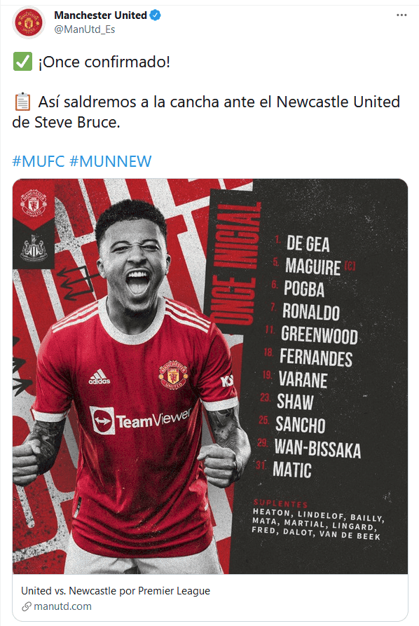 Cristiano Ronaldo será titular este sábado para enfrentarse al Newcastle United, en lo que supone su segundo debut con el Manchester United.El portugués, que firmó por el United en los últimos días del mercado de fichajes, volverá a Old Trafford, su casa desde 2003 a 2009, después de una semana de entrenamientos ya como ''Diablo Rojo''.Su presencia en el partido de la Premier League ya estaba asegurada, tal y como confirmó en rueda de prensa el noruego Ole Gunnar Solskjaer, pero no ha sido hasta que han salido las alineaciones que se ha desvelado su titularidad.El partido será en punto de las 09:00 horas tiempo del centro de México.¿Quieres saber más?Si quieres tener más contenido, más imágenes y aún más noticias, entonces descarga INFORMAPlus, la aplicación digital de EL INFORMADOR, donde tenemos materiales exclusivos para ti.Descarga la aplicación y pruébala GRATIS por treinta días.Si eres suscriptor de EL INFORMADOR tu acceso está incluido, solicítalo al 33 3678-7777OF