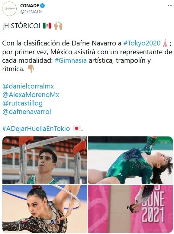 La jalisciense Dafne Navarro ha logrado un boleto histórico, pues al clasificarse a los Juegos Olímpicos de Tokio 2020, México tendrá por primera vez una representante dentro de la gimnasia de trampolín.Fue este lunes cuando se dio a conocer su clasificación de manera oficial, pues Navarro aseguró su lugar en la justa veraniega al ser incluida por la Federación Internacional de Gimnasia en el puesto número 15 del ranking mundial.Con esta noticia, la medallista de bronce en los Juegos Panamericanos de Lima se unió oficialmente a la lista de jaliscienses clasificados a Tokio, misma que ya ascendió hasta los 17 representantes.De esta forma, las disciplinas en las que Jalisco tiene atletas clasificados son las siguientes: triatlón (3), atletismo (3), tiro deportivo (2), vela (2), clavados (2), pentatlón moderno (1), natación artística (1), luchas (1), golf (1) y ahora gimnasia de trampolín (1).OA