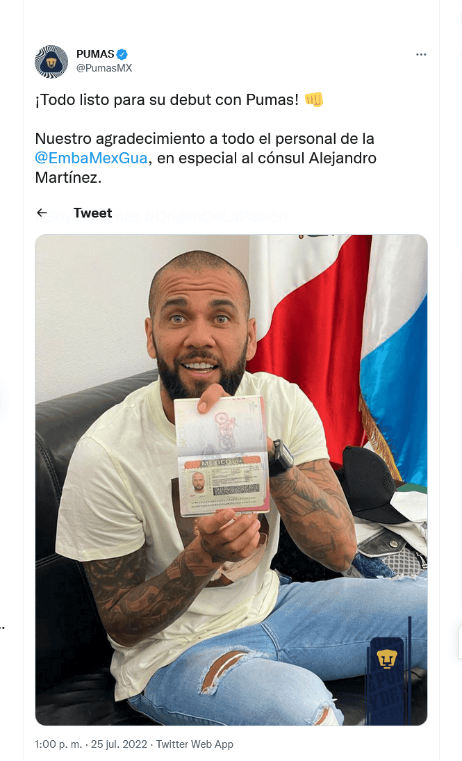 Cada vez falta menos para que veamos el debut de Dani Alves dentro de la Liga MX, pues este día el astro brasileño recibió su visa de trabajo que le abriría las puertas para debutar con Pumas en cuanto así lo requiera el entrenador Andrés Lillini."Todo listo para su debut con Pumas. Nuestro agradecimiento a todo el personal de la Embajada de México en Guatemala, en especial al cónsul Alejandro Martínez", publicó el cuadro capitalino en sus redes sociales.En este sentido, Alves podría tener sus primeros minutos pasado mañana, pues este miércoles los Pumas recibirán a Mazatlán en la cancha de Ciudad Universitaria como parte de la quinta jornada del Torneo Apertura 2022.Antes de que Alves recibiera su visa de trabajo, el estratega Andrés Lillini ya había reconocido sus intenciones por debutar al brasileño a la brevedad, ya que después de su partido de este fin de semana ante Pachuca, habló de la posibilidad de convocarlo contra los sinaloenses."En cuanto a tenerlo en cuenta o no, mañana hace sus trámites migratorios, el martes veremos cómo está, hoy entrenó y me dijo que terminó bien, si el miércoles está bien, estará entre los 21 para Mazatlán", comentó el estratega cuando se le cuestionó al respecto.Será este miércoles a las 21:05 horas cuando los Pumas reciban al Mazatlán en la cancha del Estadio Olímpico Universitario.OF