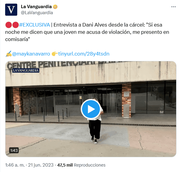 Tras cinco meses en prisión (20 de enero), Dani Alves ha decidido dar su primera entrevista desde la cárcel y emitir su versión sobre los sucedido aquella noche de diciembre en la discoteca "Sutton".Acusado de violación, el futbolista brasileño continúa detenido a pesar de todos los esfuerzos y pruebas presentadas por su abogado. Es por ello que ha decidido romper el silencio y lo hizo en charla con La Vanguardia."Quiero que la gente sepa lo que pienso, que conozca la historia a partir de lo que yo viví aquella madrugada en aquel baño. No tienen nada que ver con lo que pasó. Hasta ahora se ha explicado un relato muy asustadizo de miedo y terror que no tiene nada que ver con lo que yo hice", asegura Alves.Dani Alves, de 40 años, se encuentra en prisión provisional por una causa abierta por un presunto delito de agresión sexual. Una joven le acusa de haberle forzado presuntamente para mantener relaciones sexuales en los baños del lugar antes mencionado, a finales de diciembre."No hay ni una sola marca en su cuerpo que explique esa violencia con la que ella dice que la moví en baño... No ha habido ni una sola noche en la que yo no haya dormido tranquilo. No sé si ella tiene la conciencia tranquila y si duerme bien por las noches... Pero yo la perdono", lanzó contundente.Dani Alves ha sido señalado de dar diferentes versiones de lo sucedido aquella noche y esa situación le ha afectado en el juicio; sin embargo, explica que lo hizo por miedo."Tuve miedo de perder a Joana (su esposa) y por eso mentí. Luché a la desesperada por salvar mi matrimonio de una infidelidad, sin importarme las consecuencias que estoy pagando... A la única persona que le tengo que pedir perdón es a Joana Sanz", agregó. OF
