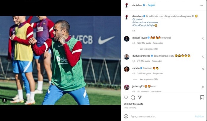 El nuevo refuerzo del Barcelona y leyenda del futbol mundial, Dani Alves, demostró de nueva cuenta su afecto hacia México y los mexicanos, y ahora alabó a Saúl "Canelo" Álvarez en una publicación de Instagram.A través de su cuenta personal, el crack brasileño compartió una foto, en donde aparece en posición de pelea, misma que acompañó con un "Al estilo del más chingon de los chingones; el Canelo", escribió.Por su parte, el "Canelo" Álvarez no se quedó sin reacción y comentó en la foto: "Esooo", comentario que fue muy reaccionado por la gente.Alves se encuentra entrenando con el conjunto Blaugrana con normalidad, sin embargo, será hasta enero cuando pueda hacer su debut con el Barcelona en su segunda etapa.JL