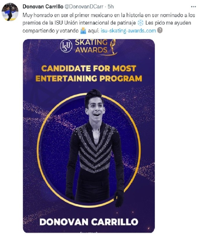 El patinador mexicano Donovan Carrillo sigue haciendo historia, y llevando su nombre y el de México a lugares donde antes no habían llegado, si de patinaje se habla.El mismo patinador artístico de Jalisco compartió en sus redes sociales que se convirtió en el primer mexicano en estar nominado a los premios de la Unión Internacional de Patinaje sobre Hielo (ISU)."Muy honrado en ser el primer mexicano en la historia en ser nominado a los premios de la ISU Unión internacional de patinaje", escribió Carrillo, quien además hizo la invitación para que voten por él y pueda llevarse el reconocimiento.Donovan ha tenido destacadas actuaciones representando a nuestro país e incluso ya debutó en Juegos Olímpicos de Invierno, justo en los que se realizaron este 2022 en Beijing.MF
