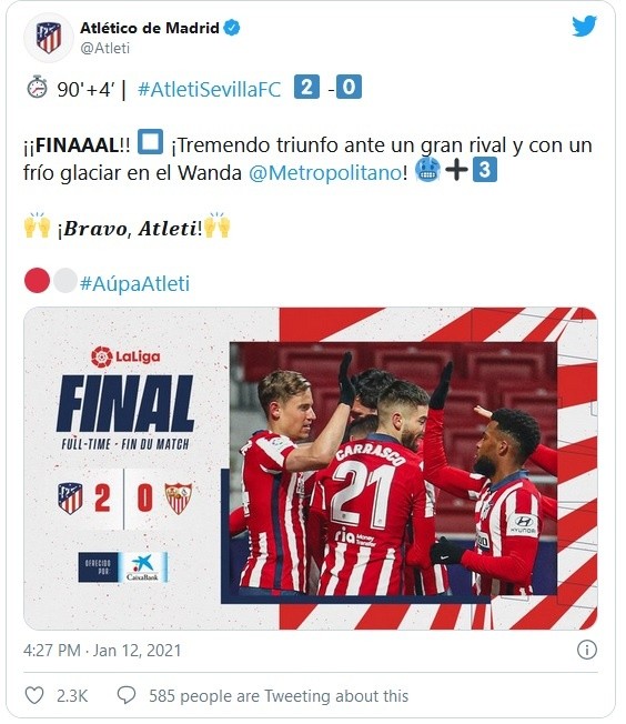 El Atlético de Madrid ganó 2-0 al Sevilla este martes en un partido aplazado de la primera jornada de LaLiga para afianzarse como líder del campeonato español.El argentino Ángel Correa abrió el marcador (17) y Saúl Ñíguez puso el 2-0 (75), dando los tres puntos al equipo rojiblanco en un partido, que recuperaba el aplazado en septiembre pasado, para dar tiempo de descanso a ambos equipos tras sus compromisos europeos.Con el marcador a favor tras el primer tanto, los rojiblancos se cerraron atrás, dejando la mayor parte del tiempo el control del juego a los sevillistas, pero los andaluces se estrellaron una y otra vez en el muro defensivo colchonero.La victoria mantiene a los rojiblancos líderes del campeonato con cuatro puntos de ventaja sobre el Real Madrid, que marcha en la segunda posición.El Sevilla, por su parte, sigue en la sexta plaza, marcando los puestos europeos.Antes, en otro partido aplazado de la cuarta jornada del campeonato español, el Granada ganó 2-0 al Osasuna, acariciando la zona europea de la clasificación.El colombiano Luis Suárez abrió el marcador para el equipo nazarí (22), antes de que el portero osasunista Sergio Herrera marcara en propia puerta acosado por el venezolano del Granada Darwin Machís (45+1).La victoria deja al Granada en la séptima posición de la clasificación Liguera, a sólo tres puntos del Sevilla.JM