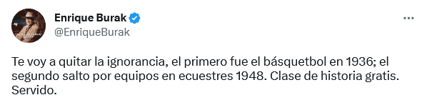 El reconocido periodista deportivo de Televisa, Enrique Burak, encendió las redes sociales al responder de forma épica al mensaje de un usuario de Twitter.El comentarista de TUDN lanzó una imagen destacando que la Selección Mexicana de Beisbol era el primer equipo tricolor en conjunto, en llegar a semifinales durante un Mundial.El tuitero respondió de manera airada: "No le hagas a la mam… Burak. ¿Sabías que el futbol es el único deporte de conjunto en que México ha ganado una medalla olímpica?".A lo que Burak respondió ganando los aplausos de sus seguidores: "Te voy a quitar la ignorancia, el primero fue el básquetbol en 1936; el segundo salto por equipos en ecuestres 1948. Clase de historia gratis. Servido".OF
