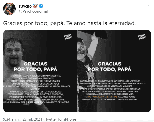 Aunque el último adiós del luchador Súper Porky fue realizado de forma privada, con amigos y familia más cercanos, su hijo, Psycho Clown, compartió en sus redes sociales parte del trayecto del féretro de su padre hasta el cementerio. Fue una despedida emotiva, aderezada por la música que le gustaba a José Alvarado Nieves, con canciones como "Estos Celos" de Vicente Fernández, dando un vuelco a la melodía que identificó al máximo momento de popularidad del Brazo de Plata: "La Bomba".Rodeado de porras, el cortejo avanzó hasta la morada final del exgladiador, pero antes, Psycho entonó cerca de la carrosa fúnebre, "El monstruo", una canción que solía dedicarle a su progenitor. "Abrázame padre, no apagues la luz, dime que no te irás a pesar de mi edad. Sigo teniendo miedo, miedo a la oscuridad. Abrázame padre, cerremos la puerta, debemos hablar, el monstruo anda afuera, comiéndose el alma de la humanidad", se escuchó. Con un "Hasta siempre padre", concluyó la transmisión desde el panteón San Isidro, en la alcaldía de Azcapotzalco. José Alvarado Nieves murió este lunes a la edad de 58 años debido a un infarto, dejando atrás una carrera de 44 años en los encordados.¿Quieres saber más?Si quieres tener más contenido, más imágenes y aún más noticias, entonces descarga y descubre INFORMAPlus, la aplicación digital de EL INFORMADOR, donde tenemos materiales exclusivos para tí.Descarga la aplicación y pruébala GRATIS por treinta días. Para iOS: https://apple.co/35jaVgb Para Android: https://bit.ly/3gwVSEVAF