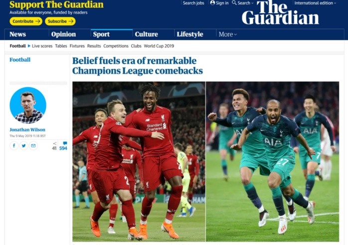 La prensa británica destaca este jueves la histórica remontada del Tottenham ante el Ajax, que le valió la clasificación para la final de la Liga de Campeones que disputará contra el Liverpool, el 1 de junio en el Wanda Metropolitano de Madrid.The Times apunta al "hat trick" de Lucas Moura como un "símbolo de fe de Pochettino en la plantilla al completo de los Spurs", que este miércoles logró remontar el 2-0 de la ida.The Guardian habla de una "era de remontadas notables de la Liga de Campeones", en alusión también a la victoria del Liverpool, que dará lugar a un duelo entre equipos ingleses y destaca que ambos equipos "se recuperaron de situaciones aparentemente imposibles para demostrar que, en Liga de Campeones, todo es posible".El Liverpool superó 4-0 al Barcelona el pasado martes y se aseguró así su puesto para la final en el Wanda Metropolitano.La BBC destaco la "dramática" reacción del equipo de Mauricio Pochettino y apunta a que la "inspiración del Liverpool" le sirvió para ganar su pase a la final.En la misma línea, Sky Sports abrió su edición con las declaraciones de Kieran Trippier, quien reveló que fueron las palabras del delantero Harry Kane las que "inspiraron" al equipo "durante el descanso" e hicieron posible la victoria.Kane, que se lesionó en la ida de cuartos de final ante el Manchester City y desde entonces ha permanecido fuera de los terrenos de juego por un problema en los ligamentos del tobillo, dejó ayer abierta la puerta a poder disputar la final.OF