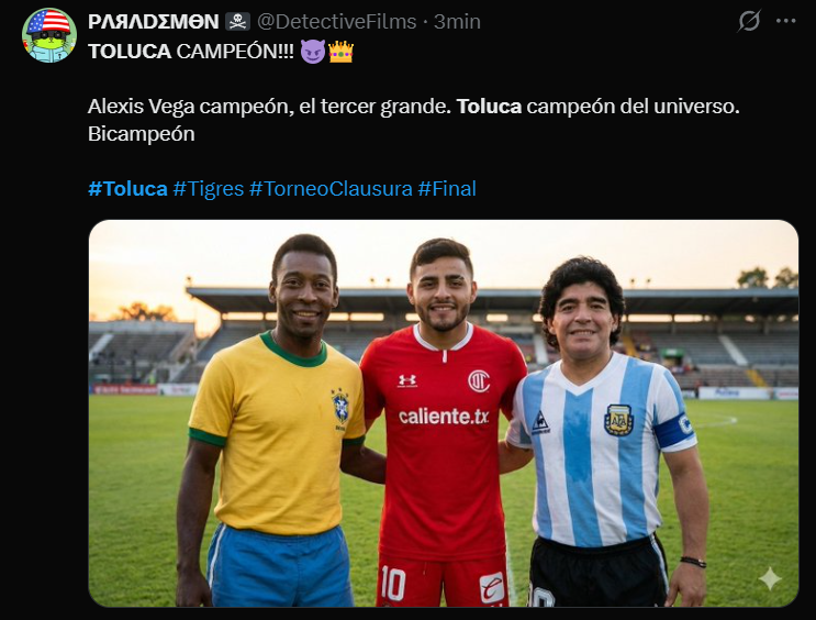 Toluca volvió a escribir su nombre en lo más alto del futbol mexicano al lograr el bicampeonato del Torneo Apertura 2025 de la Liga MX, tras vencer a Tigres UANL en una definición de máxima tensión desde el punto penal, en la que los Diablos Rojos se impusieron 9-8 después de que el marcador global quedara empatado 2-2 al concluir los tiempos reglamentarios y el extra en el Estadio Nemesio Díez, ante su afición.El partido fue un verdadero contraste de emociones. Tigres sorprendió temprano con un tanto que puso en ventaja la serie, obligando a Toluca a reestructurar su enfoque ofensivo. El conjunto escarlata respondió antes del descanso equilibrando el marcador y continuó presionando en la segunda mitad, hasta que logró darle vuelta al resultado parcial en el Nemesio Díez. Con la igualdad en el global, el título necesitó de postemporada y, finalmente, de penales. En una tanda extensa y dramática, Toluca consiguió la ventaja definitiva para coronarse nuevamente, refrendando así su condición de campeón y consolidándose como uno de los equipos más sólidos del año futbolístico mexicano. Tras el partido, los usuarios en redes sociales no perdieron un solo segundo y comenzaron con la lluvia de memes; te compartimos los mejores: