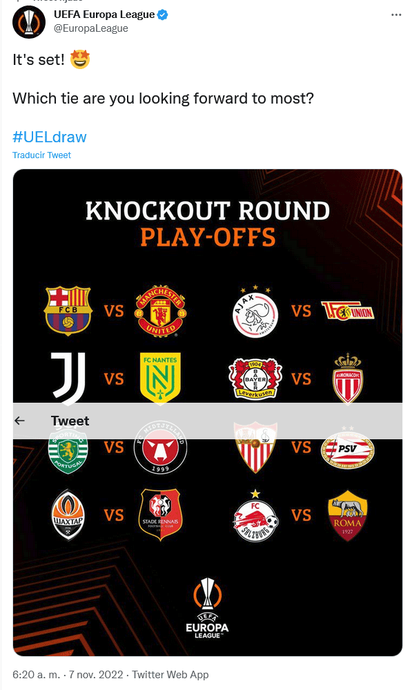 Hoy lunes 7 de noviembre se realizó en Nyon, Suiza, el sorteo que definió los partidos de los octavos de final de la Champions League de la UEFA, así como de dieciseisavos de la Europa League y Europa Conference League, en su temporada 2022-2023.Entre los duelos estelares de la Europa League destaca el regreso de Cristiano Ronaldo al Camp Nou con el Manchester United, para medirse al Barcelona.De acuerdo con el calendario de la UEFA, se tiene contemplado que los encuentros de la segunda fase de dieciseisavos de final de la Europa League y Europa Conference League se jueguen los días 16 de febrero la ida, mientras que la vuelta será el día 23.OF