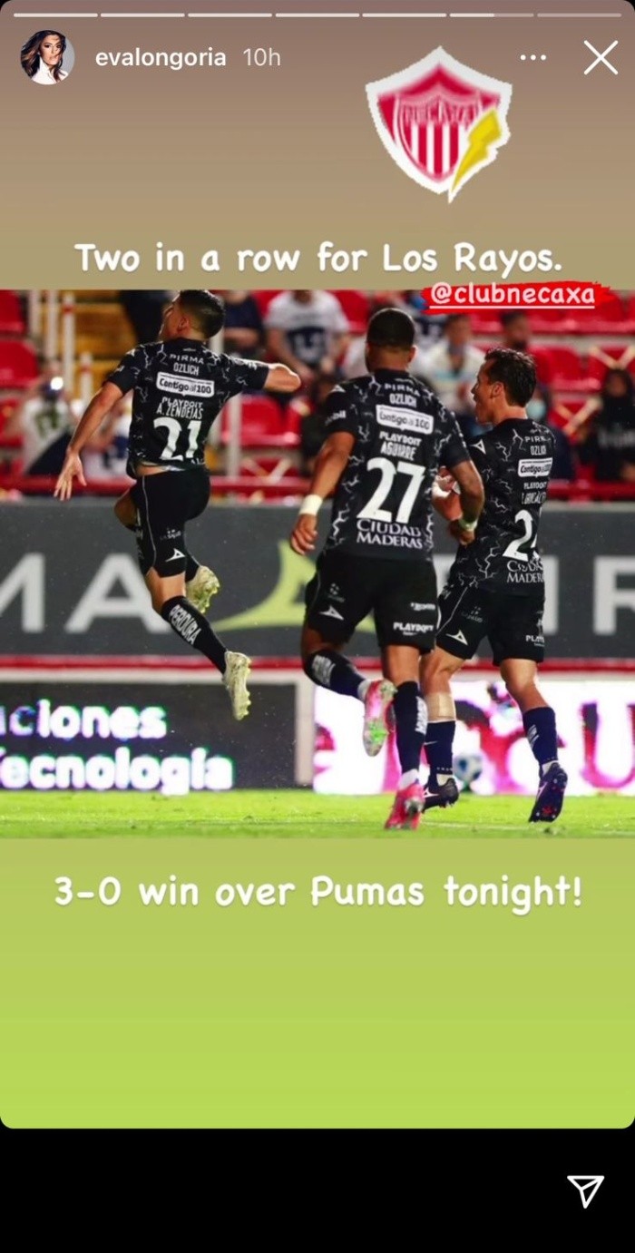 Necaxa ganó y goleó a Pumas en la Jornada 5 del Apertura 2021; esta victoria no sólo la celebraron los fanáticos en Aguascalientes, pues su inversionista Eva Longoria también presumió el triunfo en sus redes. La actriz, productora, directora y ahora inversionista de los Rayos compartió en las Stories de su cuenta de Instagram una imagen del partido con el resultado."Dos seguidos para Los Rayos. Ganaron 3-0 sobre los Pumas esta noche" escribió Longoria en sus stories junto a la foto del festejo del segundo gol anotado por Alejandro Zendejas. Eva Longoria es parte del grupo de inversionistas extranjeros del Necaxa, en dicho conjunto también aparecen el jugador alemán Mesut Özil, el beisbolista Justin Verlander y la modelo Kate Upton, entre otras personalidades; los dueños de la Liga MX autorizaron su participación financiera en la última asamblea.Necaxa con la victoria sobre los "auriazules" llegó a seis puntos que lo colocan momentáneamente en la posición número 11 de la tabla general. Para la Jornada 6, los Rayos reciben a Juárez el próximo domingo 22 de agosto.¿Quieres saber más?Si quieres tener más contenido, más imágenes y aún más noticias, entonces descarga INFORMAPlus, la aplicación digital de EL INFORMADOR, donde tenemos materiales exclusivos para ti.Descarga la aplicación y pruébala GRATIS por treinta días.Si eres suscriptor de EL INFORMADOR tu acceso está incluido, solicítalo al 33 3678-7777OF