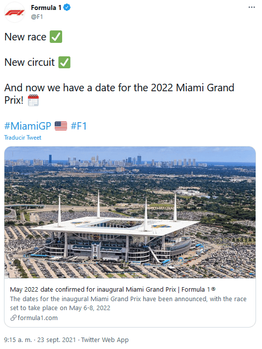 El Gran Premio de Miami (GP de Miami) de Fórmula Uno (F1) se celebrará el fin de semana del 6 al 8 de mayo de 2022, anunciaron los organizadores de la prueba según confirmó este jueves la página oficial de la categoría reina del automovilismo.El evento se llevará a cabo el segundo domingo de mayo del próximo año y la acción se dividirá en tres días, con la práctica el viernes, la clasificación el sábado y la carrera el último día de la semana.El circuito será el Autódromo Internacional de Miami, dentro del campus del Hard Rock Stadium, que es sede del equipo de futbol americano de los Dolphins y ha albergado entre otros, seis ediciones del Super Bowl.Miami será el undécimo lugar que visitará la Fórmula 1 en Estados Unidos desde que comenzó el Campeonato en 1950, después de Indianápolis, Sebring, Riverside, Watkins Glen, Long Beach, Las Vegas, Detroit, Dallas, Phoenix y el Circuito de las Américas en Austin.En 2019 la Fórmula 1 y el estadio Hard Rock anunciaron la firma de un acuerdo preliminar para llevar a cabo esa competición, después de un fallido intento de que discurriera por el centro de la ciudad de Miami.¿Quieres saber más?Si quieres tener más contenido, más imágenes y aún más noticias, entonces descarga INFORMAPlus, la aplicación digital de EL INFORMADOR, donde tenemos materiales exclusivos para ti.Descarga la aplicación y pruébala GRATIS por treinta días.Si eres suscriptor de EL INFORMADOR tu acceso está incluido, solicítalo al 33 3678-7777OF