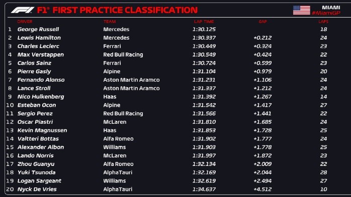 El mexicano Sergio "Checo" Pérez (Red Bull) terminó fuera de los 10 mejores en la primera práctica libre del Gran Premio de Miami, el cual se llevará a cabo este domingo en torno al Hard Rock Stadium de Miami Gardens, Estados Unidos.El inglés George Russell (Mercedes) marcó el mejor tiempo del primer ensayo de la que será la quinta carrera del Mundial de Fórmula 1 (F1).En su mejor vuelta, Russell cubrió los 5.412 kilómetros de la calurosa pista del estado de Florida en un minuto, treinta segundos y 125 milésimas, 212 menos que su compañero y compatriota el séptuple campeón mundial Lewis Hamilton y con una ventaja de 324 milésimas sobre el monegasco Charles Leclerc (Ferrari), que marcó el tercer tiempo de la sesión.Checo Pérez concluyó en el lugar 11, detrás de Esteban Ocon (Alpine), y delante de Oscar Piastri (McLaren).Con información de EFEOF