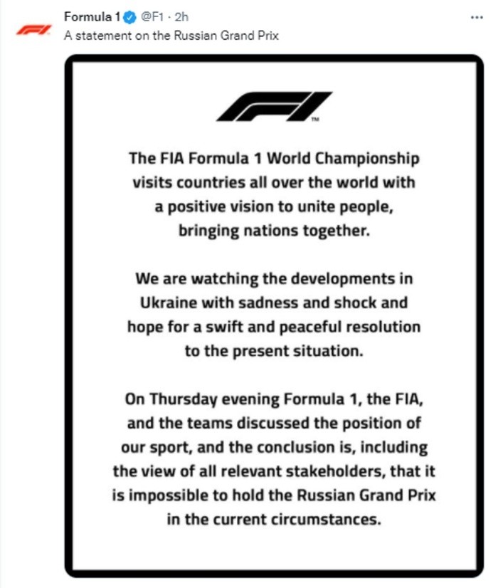 El Gran Premio de Rusia de Fórmula 1 (F1), programado para el 25 de septiembre en Sochi, fue cancelado según anunció hoy viernes 25 de febrero el promotor del campeonato del mundo, tras la invasión de Ucrania por el ejército ruso."El jueves por la noche, la Fórmula 1, la FIA (Federación Internacional del Automóvil) y los equipos discutimos el posicionamiento de nuestro deporte y la conclusión es que, teniendo en cuenta la opinión de todas las partes afectadas, es imposible organizar el Gran Premio de Rusia en las circunstancias actuales", explicó el promotor de la F1, Formula One, en un comunicado."Seguimos los acontecimientos en Ucrania con tristeza y estupor y esperamos una resolución rápida y pacífica de la situación actual", añadió la nota.Esta decisión llega al día siguiente de que varios pilotos de la parrilla, entre ellos los campeones del mundo Max Verstappen (2021) y Sebastian Vettel (2010, 2011, 2012 y 2014), exigieran que la carrera fuera cancelada."Es horrible ver lo que pasa. Por mi parte, mi opinión es que no debería ir, no iré", dijo Vettel en conferencia de prensa coincidiendo con los entrenamientos de pretemporada que se están realizando en el circuito de Montmeló, cerca de Barcelona (nordeste de España)."Lo siento mucho por las personas inocentes que pierden la vida, que mueren por razones estúpidas", por unos "dirigentes muy extraños y locos. Vamos a hablarlo, pero ya he tomado mi decisión", insistió el piloto de Aston Martin."Cuando un país está en guerra, lo correcto es no correr allí, eso es seguro. Pero lo que cuenta no es lo que pienso, decidirá el conjunto del paddock", dijo, por su parte, el vigente campeón mundial, el holandés Max Verstappen (Red Bull).OF