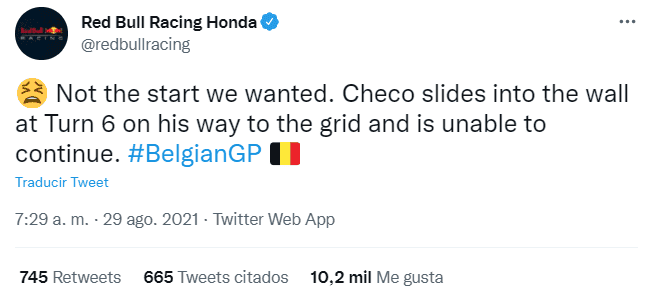 Las condiciones climatológicas le jugaron una mala pasada al piloto mexicano Sergio “Checo” Pérez, quien no podrá arrancar en el Gran Premio de Bélgica debido a que se estrelló contra la barrera de neumáticos mientras se dirigía a la parrilla de salida.La lluvia extrema en el país europeo y un descuido del mexicano propiciaron este contratiempo que dejó a “Checo” sin la posibilidad de volver a correr.“No es el comienzo que queríamos, 'Checo' se desliza contra la pared en la curva seis en su camino hacia la parrilla y no puede continuar”, publicó en Twitter la cuenta oficial de Red Bull Racing Honda.Si quieres tener más contenido, más imágenes y aún más noticias, entonces descarga INFORMAPlus, la aplicación digital de EL INFORMADOR, donde tenemos materiales exclusivos para tí.Descarga la aplicación y pruébala GRATIS por treinta días. Para iOS: https://apple.co/35jaVgbPara Android: https://bit.ly/3gwVSEVSi eres suscriptor de EL INFORMADOR tu acceso está incluido, solicítalo al 33 3678-7777gc