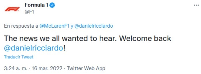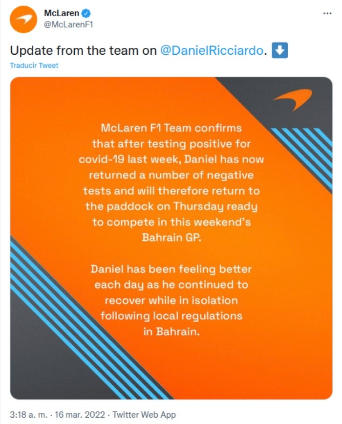 A través de un comunicado, la escudería McLaren dio a conocer que el piloto de la Fórmula 1 (F1) Daniel Ricciardo superó el COVID-19. El australiano dio negativo en las pruebas que se le realizaron este miércoles 16 de marzo.Ricciardo dio positivo la semana pasada, mientras se realizaban las pruebas de pretemporada en Baréin en las que él no pudo participar."McLaren F1 Team confirma que después de dar positivo en COVID-19 la semana pasada, Daniel Ricciardo ya ha dado negativo y, por lo tanto, volverá al 'paddock' el jueves y estará listo para competir este fin de semana en el GP de Baréin", dice el equipo británico.Ricciardo podrá arrancar sin problema el Mundial de F1 2022."Daniel se ha estado sintiendo mejor cada día mientras continuaba recuperándose durante el aislamiento, siguiendo las regulaciones locales de Baréin".La cuenta oficial de Twitter de la F1 respondió a la información con el mensaje: "La noticia que todos queríamos escuchar. ¡Bienvenido de nuevo @danielricciardo!".El Mundial de F1 2022 inicia este domingo 20 de marzo, cuando se corra el GP de Baréin en el Circuito Internacional.OF
