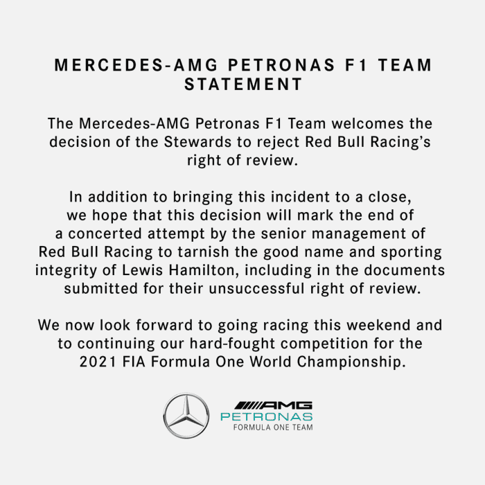 La Federación Internacional del Automóvil (FIA) rechazó este jueves la petición de una investigación por parte de Red Bull, que considera insuficiente la sanción infligida al piloto de Mercedes Lewis Hamilton luego de su choque con Max Verstappen durante el Gran Premio de Gran Bretaña.El accidente en la primera vuelta en Silverstone costó el abandono al piloto neerlandés de Red Bull, mientras que Hamilton logró la victoria.Verstappen, actual líder del Campeonato Mundial, tuvo que acudir ese mismo día al hospital para realizarse pruebas médicas que descartasen lesiones graves.La dirección de carrera sancionó con diez segundos de penalización a Hamilton, lo que no evitó que lograse la victoria ante su público.El martes Red Bull pidió una revisión de la sanción, considerada insuficiente. Pero la escudería austríaca no aportó ningún "elemento nuevo, significativo y pertinente" susceptible de justificar una revisión de la decisión tomada durante la carrera, estimó la FIA.Aunque el caso está cerrado desde el punto de vista de los jueces, la guerra dialéctica prosiguió este jueves, con una dura reacción de Mercedes a la petición de una investigación por parte de su escudería rival."Además de cerrar este incidente, esperamos que esta decisión marque el final del intento orquestado por la dirección de Red Bull Racing de mancillar el nombre y la integridad deportiva de Lewis Hamilton", escribió Mercedes en un comunicado en Twitter.El conflicto promete proseguir sobre la pista de Hungaroring entre los dos primeros pilotos del Mundial. Si quieres tener más contenido, más imágenes y aún más noticias, entonces descarga INFORMAPlus, la aplicación digital de EL INFORMADOR, donde tenemos materiales exclusivos para tí.Descarga la aplicación y pruébala GRATIS por treinta días. Para iOS: https://apple.co/35jaVgbPara Android: https://bit.ly/3gwVSEVJL