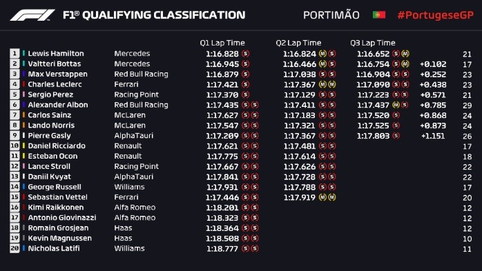 Lewis Hamilton (Mercedes) se llevó este sábado la ''pole position'' del Gran Premio de Portugal al firmar, en el circuito de Portimao, el mejor tiempo por delante de su compañero de equipo, el finlandés Valtteri Bottas.Se trata de la novena ''pole'' de la temporada para el británico y la 97 de su carrera. En caso de victoria el domingo, se convertirá en el piloto con más victorias en Grandes Premios de la F1 con 92 triunfos, por los 91 de la leyenda alemana Michael Schumacher.El neerlandés Max Verstappen (Red Bull) saldrá tercero y el monegasco Charles Leclerc (Ferrari), cuarto.OF