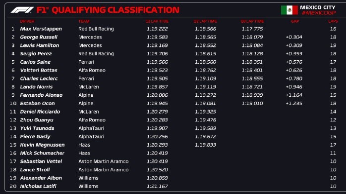 Todo listo para el Gran Premio de México. Este sábado se celebró la clasificación en el Autódromo Hermanos Rodríguez en donde Max Verstappen se se quedó con la pole positon marcando un tiempo de 1:17.775.Por su parte el favorito de la afición, Checo Pérez logró quedarse con el cuarto de la parrilla de salida marcando 1.19.709. El tapatío cautivó a los aficionados que se encontraban en el circuito que no dudadorn en apoyarlo, partícularmente en la Q2 cuando se encontraba fuera del top 10 y los gritos de "Checo, Checo" comenzaron a surgir. Desgraciadamente el apoyo no fue suficiente par quedarse con la primera línea de salida. Los pilotos de Mercedes, Russell y Hamilton completaron el top tres con tiempos de 1:19.583 y 1:19.706 respectivamente.El Gran Premio de México dará inicio este domingo a las 14:00 horas (ya considerando el cambio de horario) y podrá disfrutarse por Fox Sports.JL