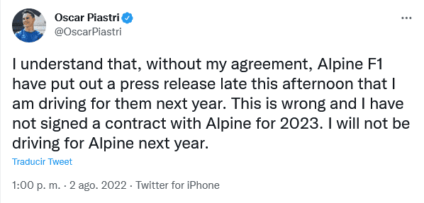 El australiano Oscar Piastri afirmó este martes que no va a pilotar "para Alpine el próximo año", pese a que el equipo francés de Fórmula 1 (F1) lo anunció como sustituto del español Fernando Alonso la temporada que viene."Entiendo que, sin mi acuerdo, Alpine F1 ha sacado un comunicado de prensa a última hora de la tarde diciendo que voy a conducir para ellos el año que viene", señala el australiano."Esto es un error y no he firmado un contrato con Alpine para 2023. No voy a pilotar para Alpine el próximo año", afirma Piastri en su cuenta de Twitter.La escudería Alpine anunció este mismo martes que a partir de la próxima temporada Piastri sería el sustituto de Alonso, cuyo fichaje por la escudería Aston Martin se comunicó el lunes.Como consecuencia del cambio de escudería de Alonso, Alpine anunció este martes que su formación de pilotos para la próxima temporada la integrarán el francés Esteban Ocon y Piastri, nacido hace 21 años en Melbourne, ganador el año pasado de la Fórmula 2 y actual probador de la escudería."Después de cuatro años como parte de la familia Renault y Alpine, nuestro piloto reserva Oscar Piastri asciende y ocupará un asiento oficial junto a Esteban Ocon a partir de 2023", indica el comunicado de Alpine.Piastri, que el año pasado fue campeón de la F2, había ganado en 2019 el de la Fórmula Renault Eurocup y en 2020 el de la Fórmula 3.OF